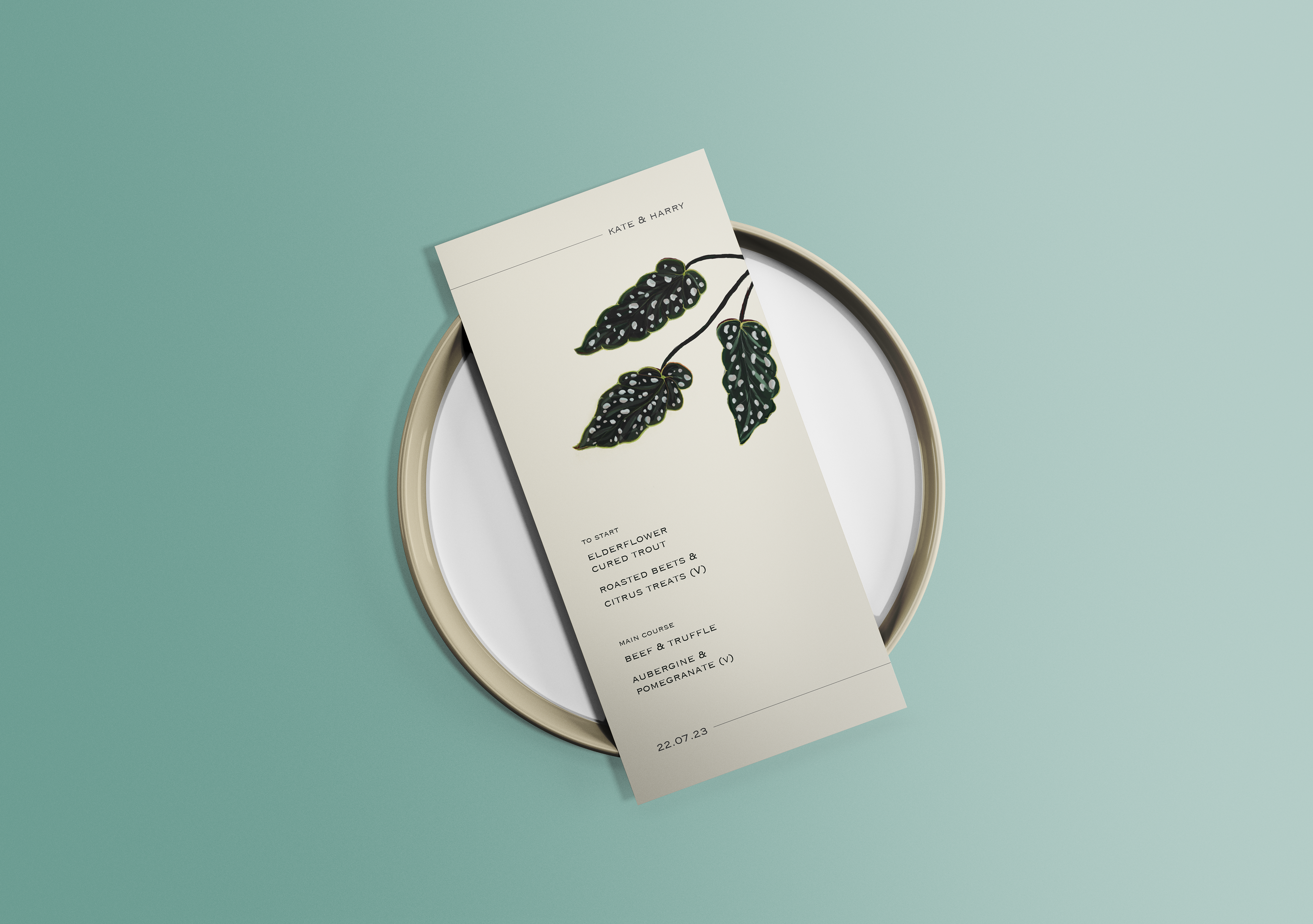 A joy to create - simple and elegant wedding menus. Clear and classy typesetting plus bespoke digitally hand drawn greenery.